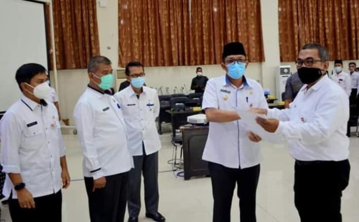 Langgam.id – Plt Wali Kota Padang Hendri Septa menyerahkan Surat Keputusan (SK) pengangkatan kepada 112 orang Pegawai Pemerintah dengan Perjanjian Kerja (PPPK) Pemko Padang formasi tahun 2019 di Balai Kota Padang, Rabu (3/3/2021).
