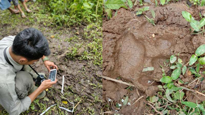 Kemudian dari hasil identifikasi lapangan, ditemukan tanda-tanda keberadaan berupa jejak dengan ukuran 11 cm. Juga terdapat jejak yang masih sangat baru, diperkirakan baru 1 jam dilalui saat ditemukan.