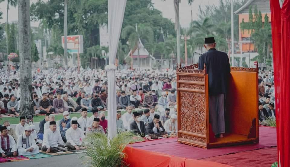 Gubernur Sumbar Mahyeldi bersama warga Padang menunaikan salat Idul Adha di lapangan kantor gubernur Sumbar pada Minggu pagi. Ribuan jemaah memadati halaman kantor gubernur hingga ke Jalan Sudirman.