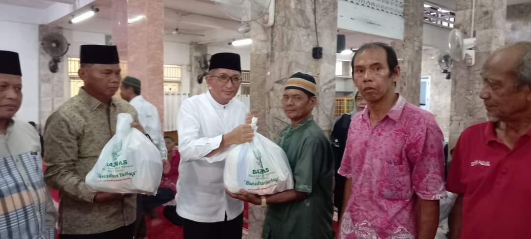 Bantuan diserahkan Wali Kota Padang Hendri Septa di Masjid Jami’ Asharullah Simpang Anam, Kecamatan Padang Barat, Minggu (17/3/2024). Tampak hadir pengurus Baznas Kota Padang.
