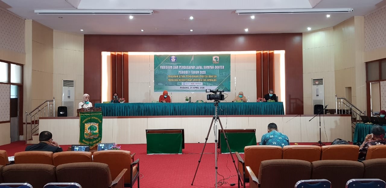 Langgam.id – Akibat pandemi Covid-19, Fakultas Kedokteran Universitas Andalas (Unand) mengadakan yudisium dan pengucapan lafal sumpah dokter periode I tahun 2020 Program Studi Pendidikan Dokter dengan cara live teleconference via zoom meeting di Aula Fakultas Kedokteran Unand Jati Padang, Selasa (21/4/2020).