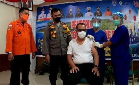Bupati Kepulauan Mentawai Yudas Sabaggalet disuntik vaksin Covid-19. (foto: Pemkab Kepulauan Mentawai)