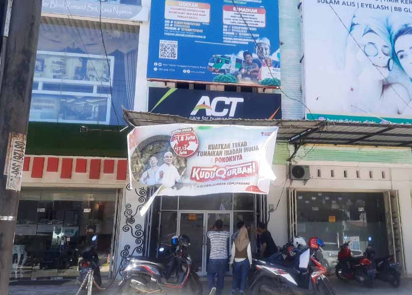 Saat langgam.id berkunjung ke kantor ACT Padang, telihat kantor itu masih buka seperti biasanya. Bagian depan kantor terdapat sejumlah sepeda motor yang terparkir. Kemudian, juga ada spanduk tentang kurban dipasang.