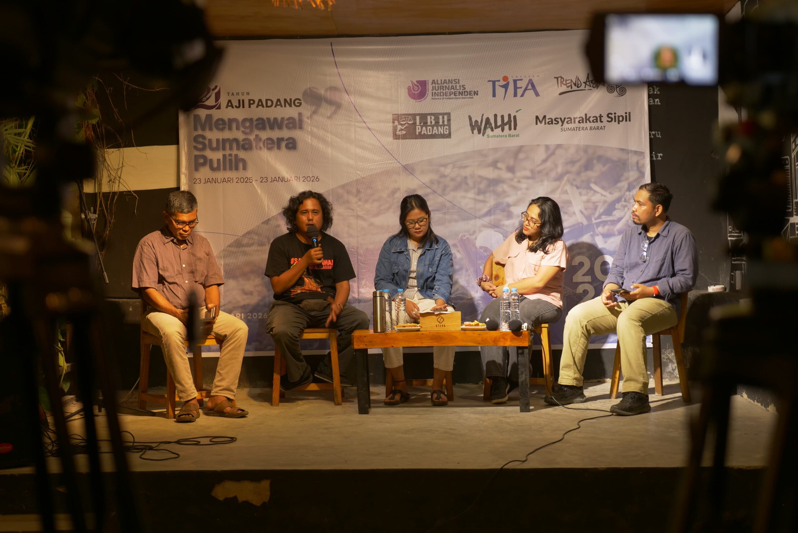Pada kegiatan diskusi lintas sektor, AJI Padang mengundang empat orang pembicara yaitu Amalya Reza dari Trend Asia, Aidil Ikhlas dari AJI Padang, Mitra Oktavia dari LBH Padang, Khalid Syaifullah dari Posko Sumbar Peduli dan dipandu oleh Yola Sastra dari AJI Padang.