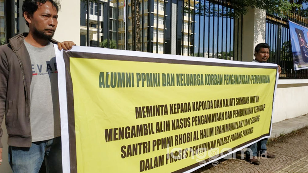 Sekira sepluh orang alumni Pondok Peantren (Ponpes) Nurul Ikhlas aksi di depan Mapolda Sumbar. Mereka meminta Polda dan Kejadi Sumbar ambil alih kasus pengeroyokan Roby yang saat ini masih dalam proses penyidikan Polresta Padang Panjang.
