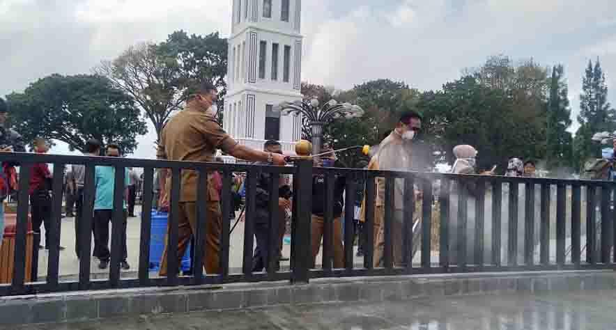 Langgam.id- Pemerintah Kota Bukittinggi menyemprotkan disinfektan ke beberapa titik fasilitas umum, untuk mencegah penyebaran virus corona (Covid-19) Selasa (17/3). Salah satunya di kawasan Jam Gadang.