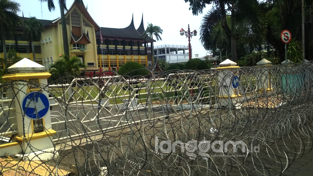Langgam.id – Polisi memasang kawat berduri di depan Kantor Gubernur Sumatra Barat, Padang, Kamis, (26/9/2019).
