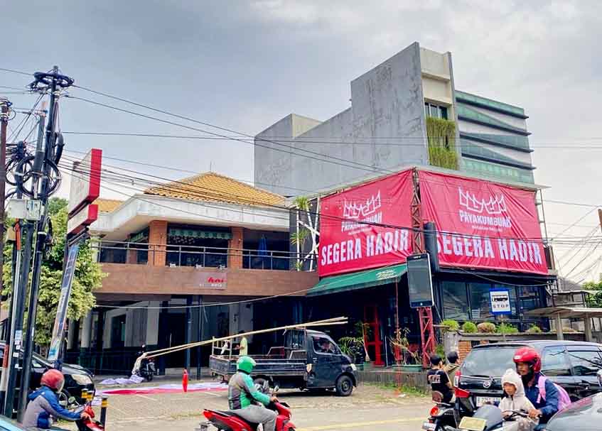Foto gedung yang diposting Arief dengan menutupnya menggunakan spanduk warna merah bertuliskan Segera Hadir dan lengkap dengan logo Padang Payakumbuah merupakan gedung bekas Social Corner.