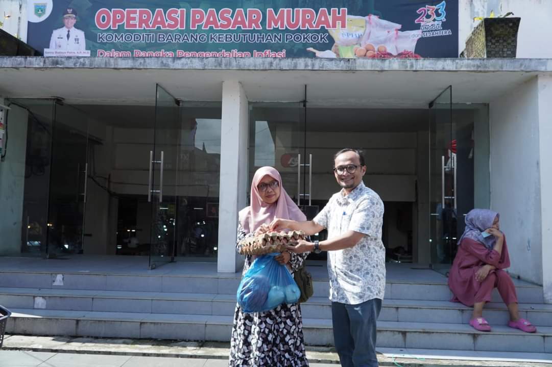 Penjabat (Pj) Wali Kota, Sonny Budaya Putra turut hadir meninjau pasar murah ini. Sekaligus memberikan bantuan sembako kepada lansia dan penyandang disabilitas.