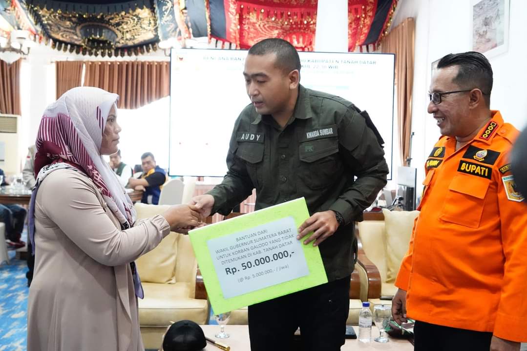 Langgam.id – Wakil Gubernur (Wagub) Sumatra Barat Audy Joinaldy memberikan bantuan sebesar Rp50 juta kepada 10 keluarga atau ahli waris korban banjir bandang dan galodo yang belum ditemukan.
