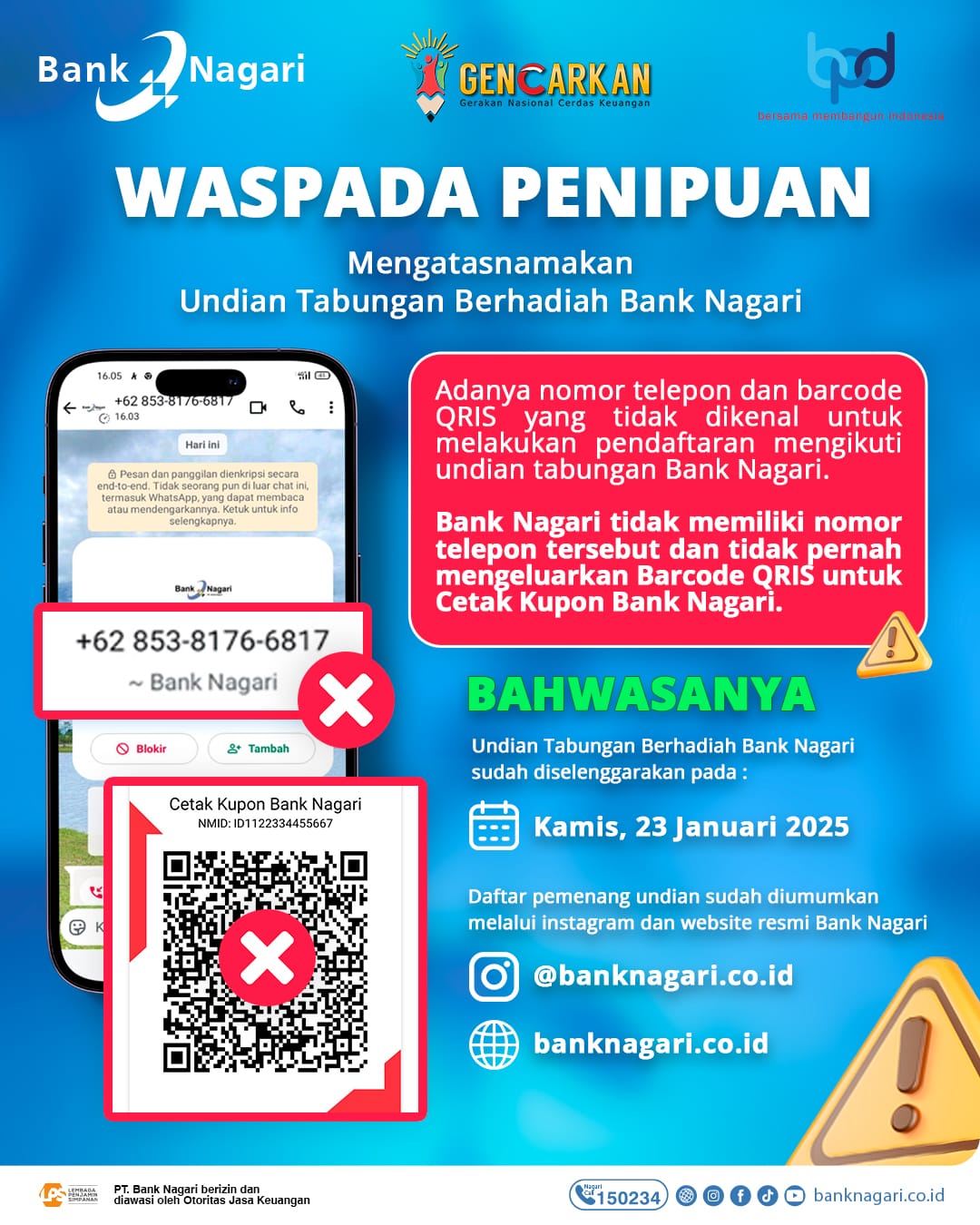 “Nasabah diminta berhati-hati terhadap berbagai aktivitas digital yang mengatasnamakan Bank Nagari, baik melalui sambungan telepon, WhatsApp, scan barcode, QRIS, maupun metode lainnya. Jika menerima informasi yang mencurigakan, segera pastikan kebenarannya kepada personel Bank Nagari atau laporkan ke Nagari Call 150234,” ujar Roni, Kamis (13/2/2025).