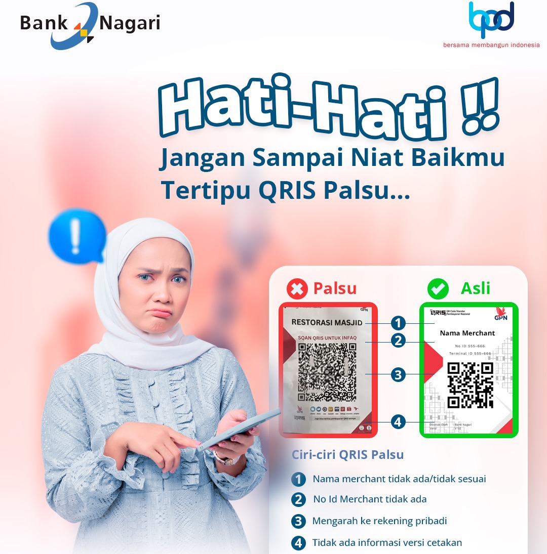 Berikutnya, waspadai penipuan dengan metode scan QR. Waspadai pula penipuan berkedok file Pdf melalui chat WA, serta waspadai pula pada pihak pihak yang mengaku ngaku dari Bank Nagari.