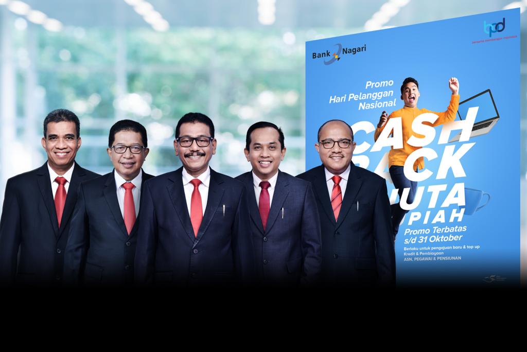 Direktur Utama Bank Nagari Muhammad Irsyad, didampingi Direktur Kredit & Syariah Gusti Candra, serta Direktur Keuangan Sania Putra, kepada awak media menyampaikan berita gembira bahwa promo Hari Pelanggan Nasional Bank Nagari berupa pemberian cashback dengan nilai sampai dengan Rp2 juta bagi ASN maupun pensiunan yang melakukan realisasi kredit konsumtif di seluruh kantor layanan Bank Nagari, dilanjutkan ke bulan Oktober.