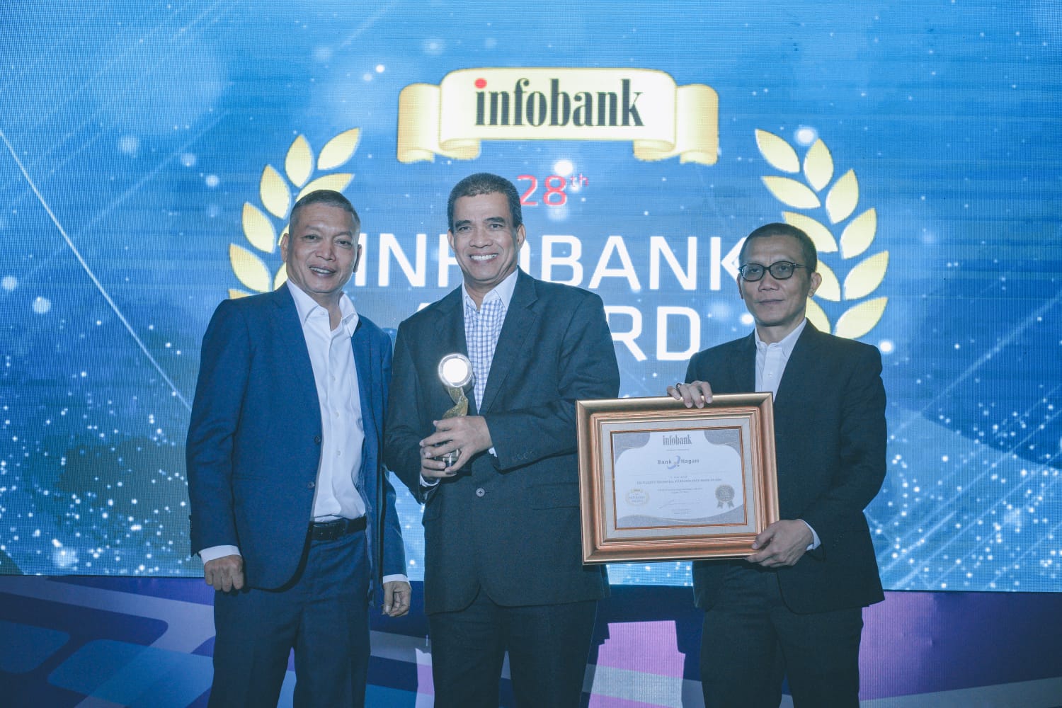 Penghargaan diterima langsung oleh Direktur Operasional Bank Nagari Syafrizal dari Chairman Infobank Media Group Eko B. Supriyanto di The Ritz Carlton, Jalan Dr. Ide Anak Agung Gde Agung No. 1, Mega Kuningan, Jakarta.