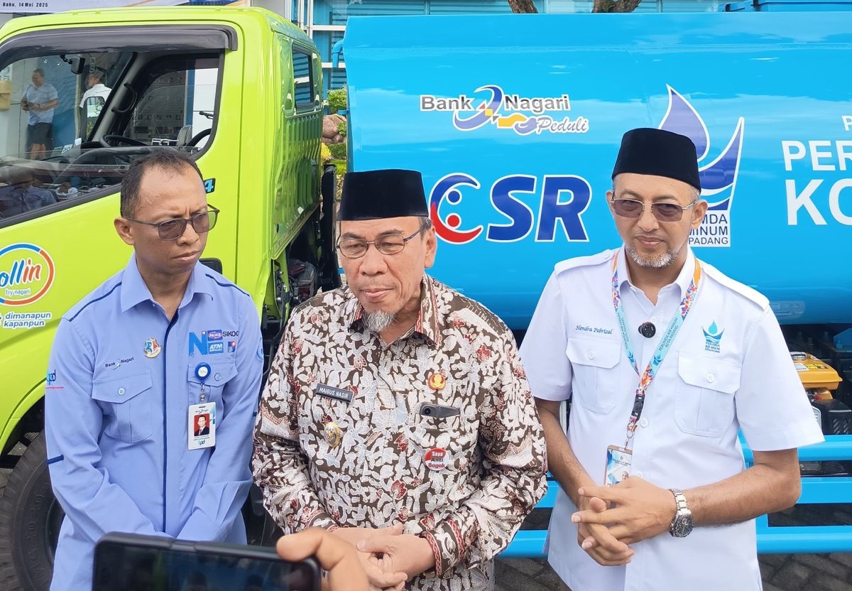Bank Nagari secara simbolis menyerahkan satu unit mobil tangki air kepada Perumda Air Minum Kota Padang. Penyerahan bantuan ini dilakukan oleh Direktur Keuangan Bank Nagari, Roni Edrian bersama Wakil Wali Kota Padang Maigus Nasir, serta Direktur Utama Perumda Air Minum Kota Padang Hendra Pebrizal.
