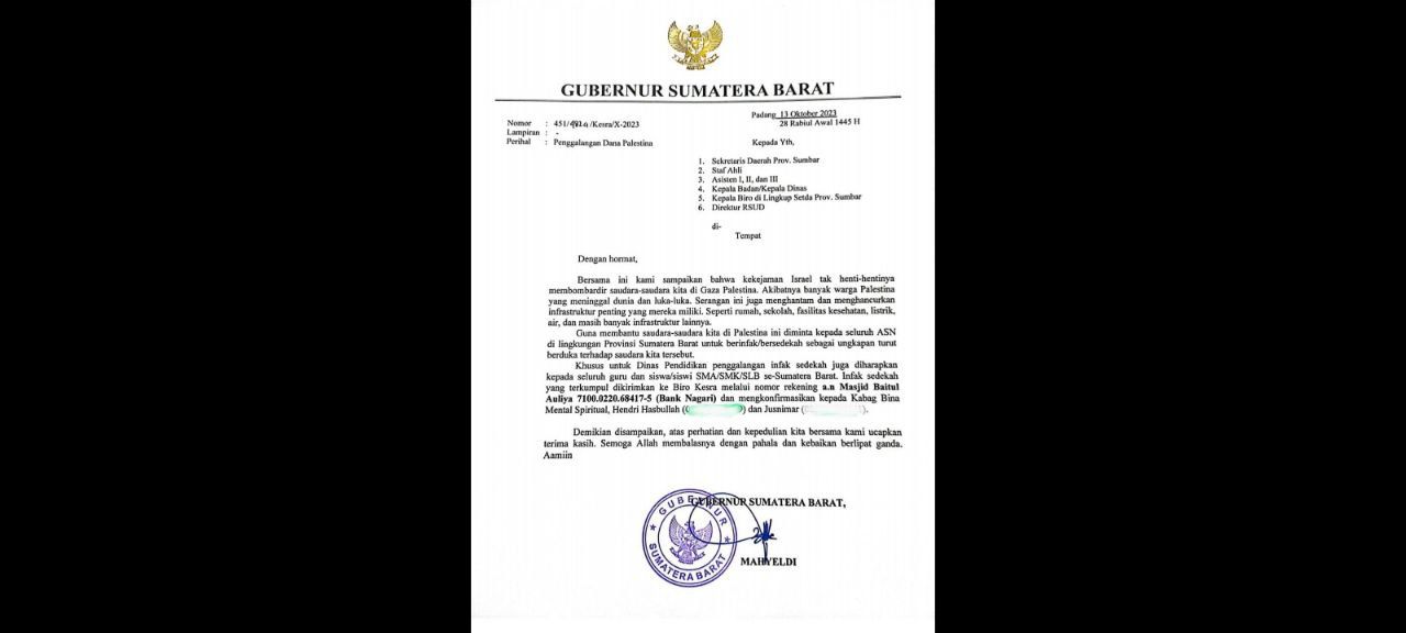 Namun, khusus untuk ASN penggalangan dana tersebut dikirimkan kepada rekening Masjid Baitul Auliya kantor Gubernur Sumbar. Surat tersebut dikeluarkan pada 18 Oktober 2023.