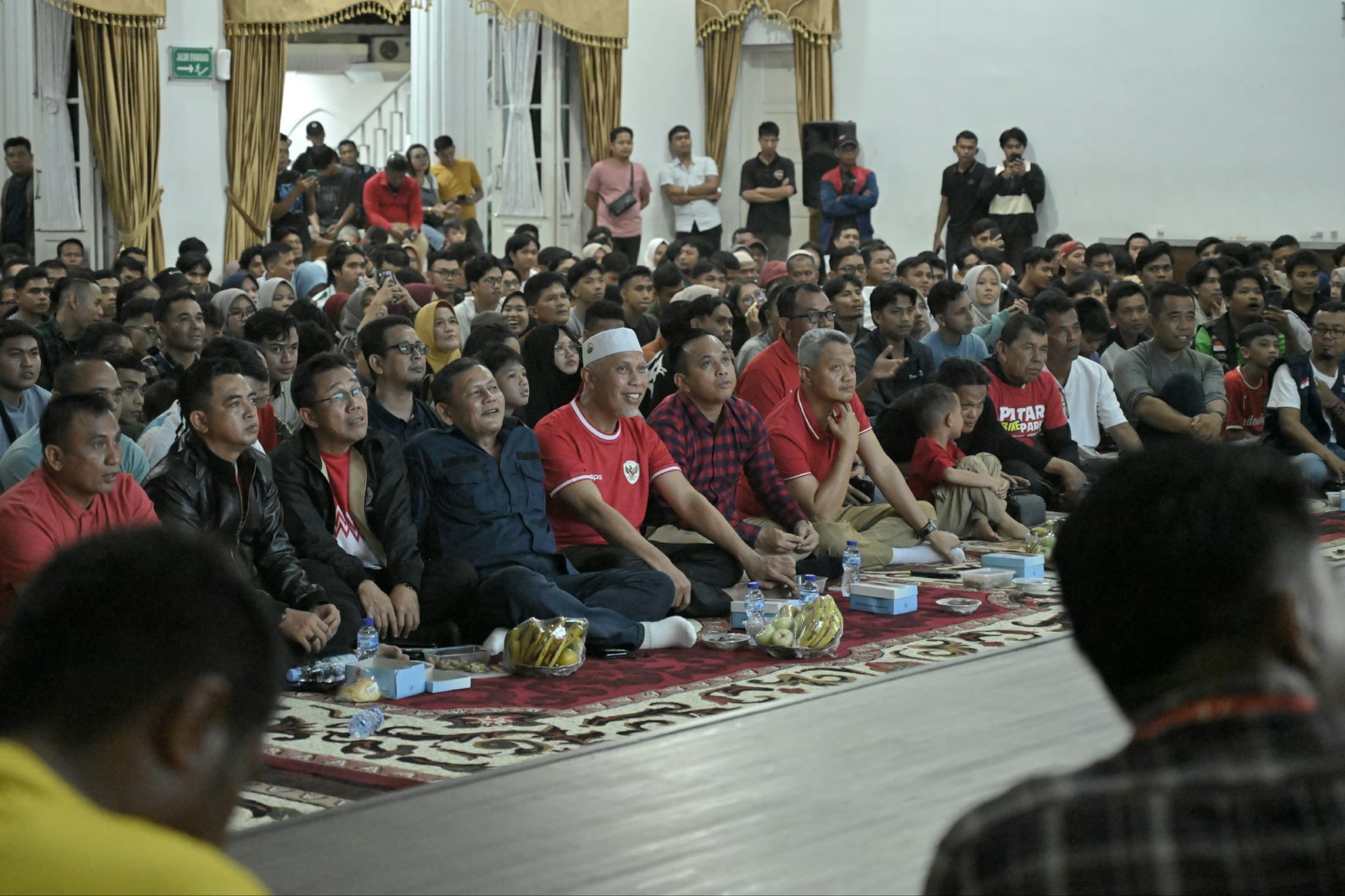 Suasana Nobar di Auditorium Istana Gubernuran begitu meriah. Gol Timnas Indonesia disambut dengan sorak gembira dan tepuk tangan meriah dari seluruh penonton. “Sepak bola telah berhasil memangkas strata sosial dan mempersatukan masyarakat. Ini hebat dan patut disyukuri bersama,” pungkas Raflis.