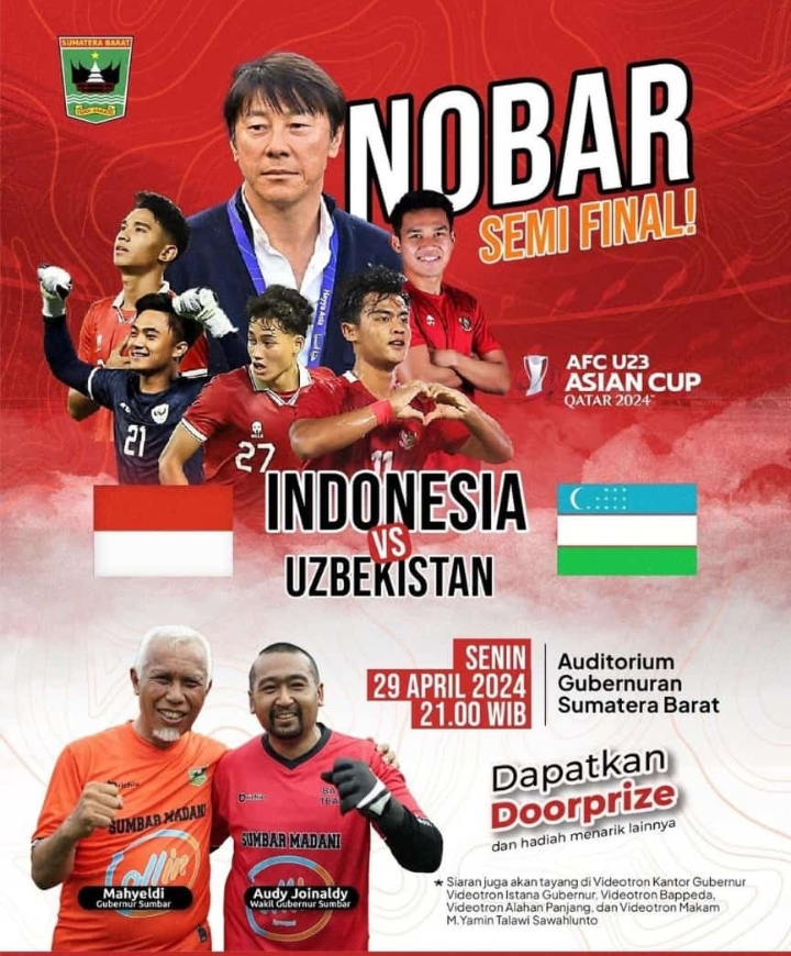 Langgam.id – Pemerintah Provinsi Sumatra Barat (Pemprov Sumbar) akan menggelar iven nonton bareng (nobar) laga semifinal AFC U23 Asian Cup 2024 antara Indonesia U23 vs Uzbekistan U23, Senin (29/04/2024) pukul 21.00 WIB.