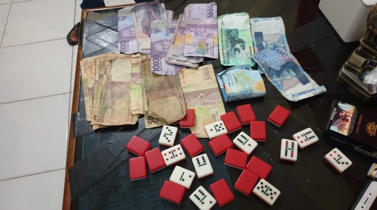 Mendapat laporan, petugas langsung bergerak ke lokasi yang dicurigai. Ternyata betul, petugas menemukan empat pelaku dengan BB uang tunai sebesar Rp340 ribu yang terdiri dari pecahan berbeda plus satu set batu domino.