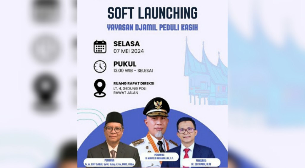 “Insya Allah soft launching Yayasan Djamil Peduli Kasih Selasa siang oleh Gubernur Sumbar, Pak Mahyeldi ,” kata Ketua Yayasan Djamil Peduli Kasih, Edi Suandi, dilansir dari infopublik.id, Senin (6/5/2024).