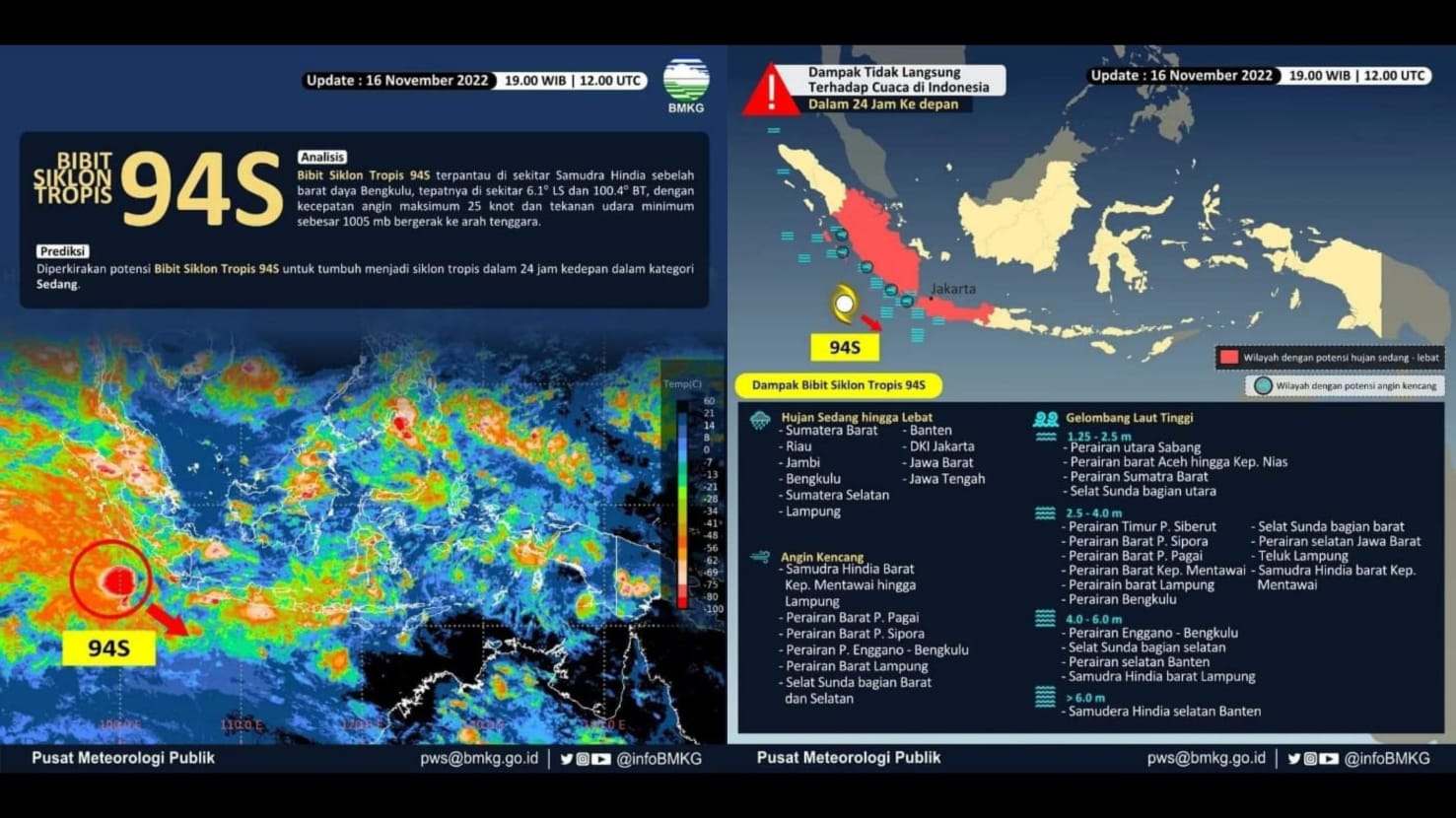 Langgam.id – Badan Meteorologi Klimatologi Geofisika (BMKG) memantau adanya pertumbuhan bibit siklon tropis yang diberi kode 94s di wilayah barat daya perairan Indonesia, Rabu (16/11/2022). Tepatnya di perairan Bengkulu, dan terus bergerak arah tenggara.