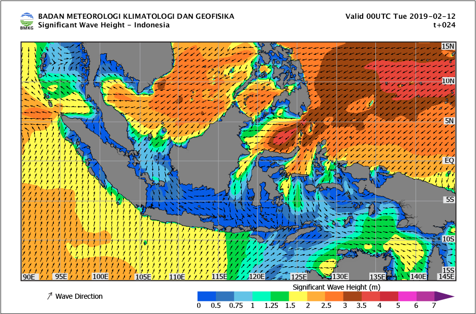 “Kecepatan angin tertinggi terpantau di Laut Cina selatan, Perairan Kep. Sangihe – Talaud dan Laut Maluku bagian utara. Kondisi ini mengakibatkan peningkatan tinggi gelombang di wilayah-wilayah tersebut,” bunyi siaran pers Humas BMKG, Senin (11/2/2019).