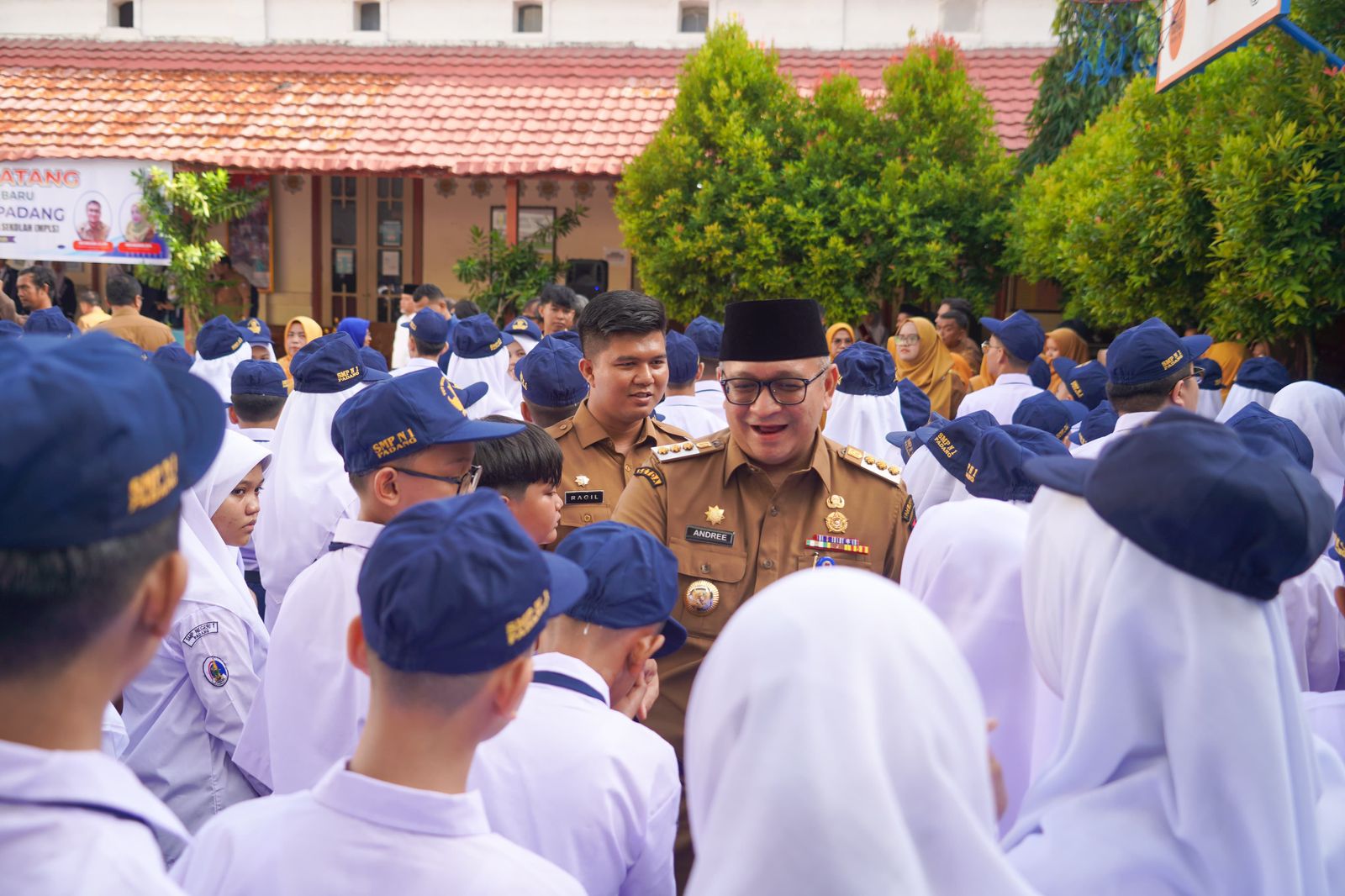“Selamat kepada seluruh anak-anak kelas 7, kalian hari ini menjadi siswa SMPN 1, tempat pernah bersekolahnya proklamator bangsa, Bapak Dr. Muhammad Hatta. Semoga di SMPN 1 Padang ini akan lahir Bung Hatta baru yang akan menjadi pemimpin bangsa, the next Bung Hatta,” ucap Andree Algamar.