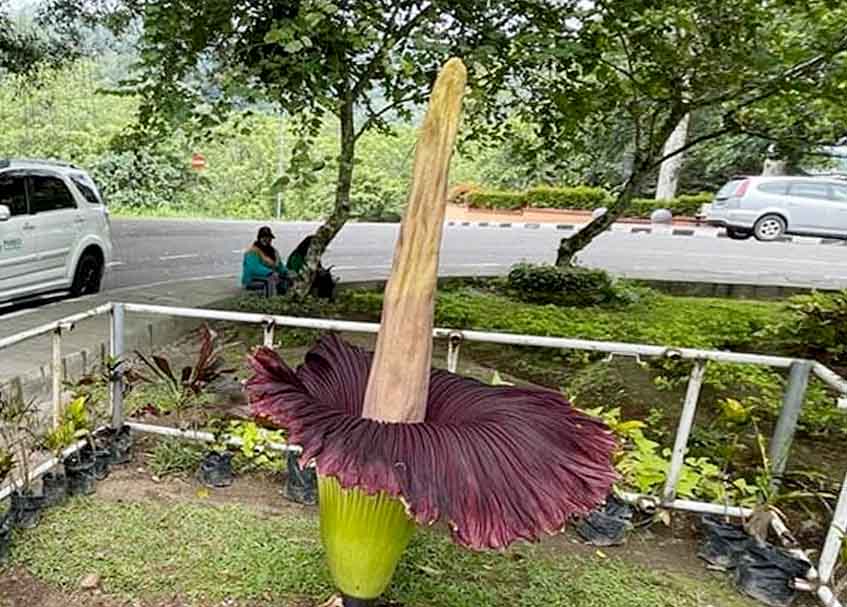Langgam.id – Bunga Bangkai Raksasa atau Suweg Raksasa dengan nama latin Amorphophallus Titanum Becc mekar sempurna di depan gerbang kawasan Pusat Dokumentasi dan Informasi Kebudayaan Minangkabau (PDIKM) Kota Padang Panjang, Selasa (5/7/2022).