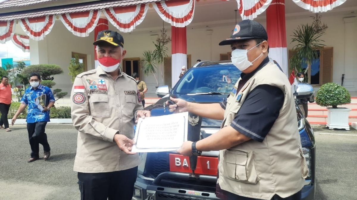 Mahyeldi menyerahkan langsung mobil dinas kepada Plh Kepala Badan Penanggulangan Bencana Daerah (BPBD) Sumbar Mulyadi sebagai tanda diserahkannya mobil untuk penanganan covid-19 di Istana Gubernur Sumbar, Kamis (19/8/2021).