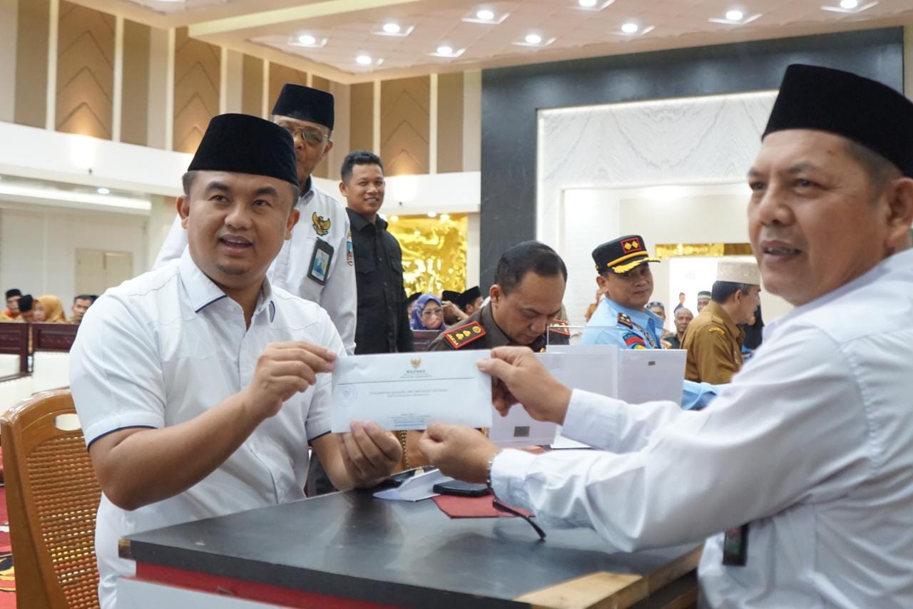 Langgam.id – Baznas Kabupaten Dharmasraya menerima zakat mal/penghasilan Bupati Sutan Riska Tuanku Kerajaan di Auditorium Kantor Bupati Dharmasraya, Pulau Punjung, Selasa (11/4/2023 ).