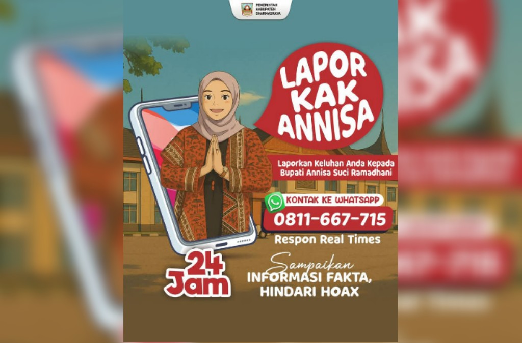InfoLanggam – Bupati Dharmasraya Annisa Suci Ramadhani meluncurkan layanan pengaduan masyarakat berbasis WhatsApp dengan nama “LAPOR KAK ANNISA”, Senin (21/4/2025).