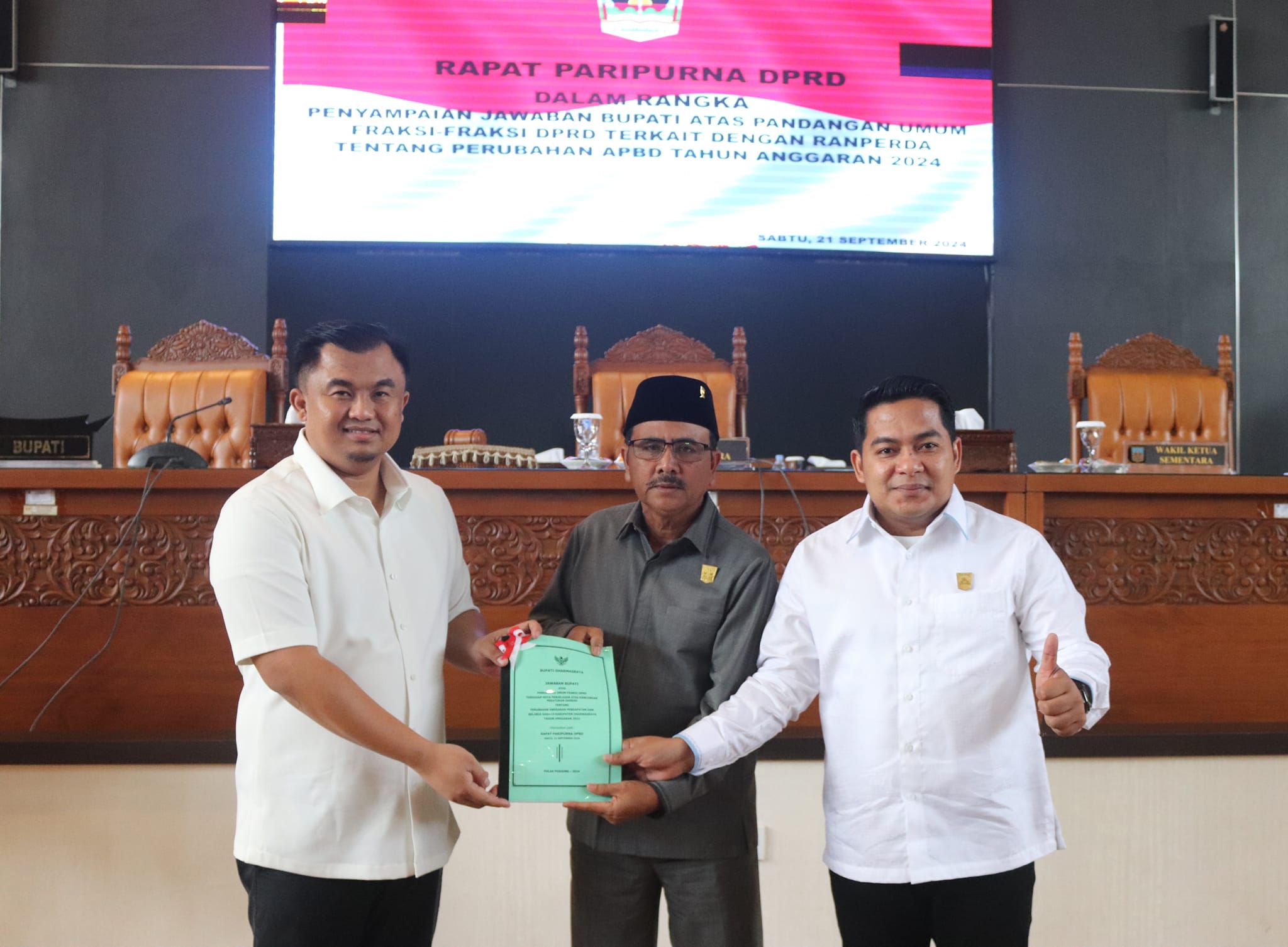 Sutan Riska menyampaikan hal tersebut pada rapat paripurna yang diselenggarakan di Ruang Rapat Utama DPRD Kabupaten Dharmasraya, Sabtu (21/9/2024).