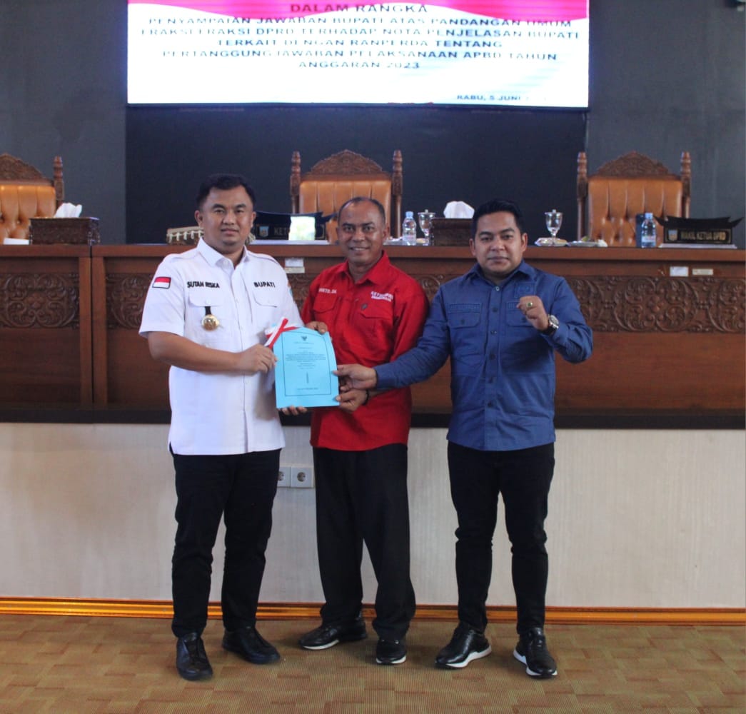 InfoLanggam – Bupati Dharmasraya, Sutan Riska Tuanku Kerajaan memberikan jawaban atas pandangan umum yang disampaikan oleh anggota DPRD terhadap Ranperda tentang Pertanggungjawaban Pelaksanaan APBD tahun anggaran 2023 dalam rapat paripurna di DPRD Dharmasraya.