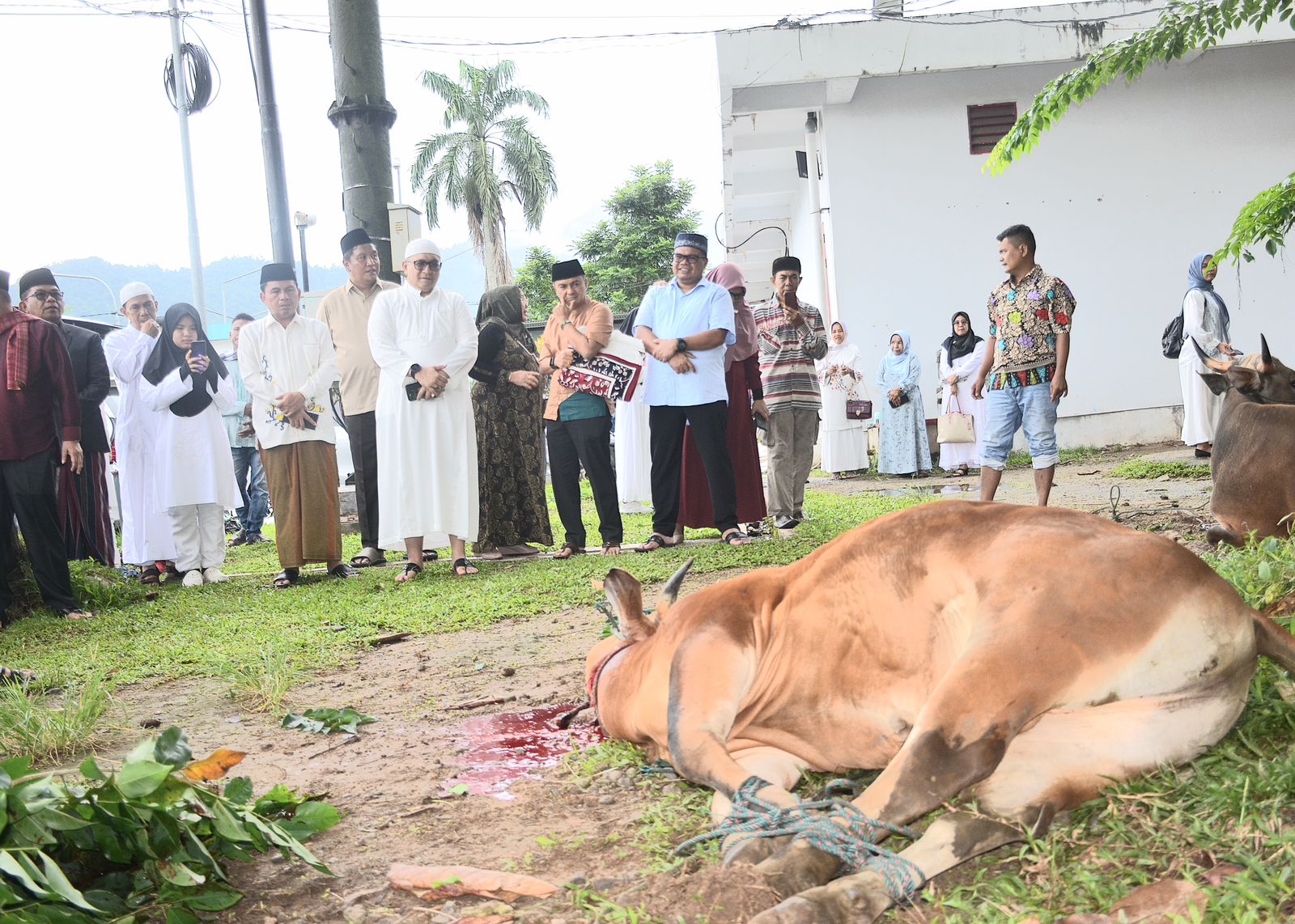 “Alhamdulillah, untuk di lingkungan Balai Kota Padang Aie Pacah ini kita melakukan penyembelihan sebanyak 5 ekor sapi qurban. Daging qurban tersebut akan kita bagikan kepada para pegawai non ASN, cleaning service serta security dan warga di sekitar Balai Kota Padang,” tukas Pj Wali Kota didampingi Kabag Kesra Jasman.