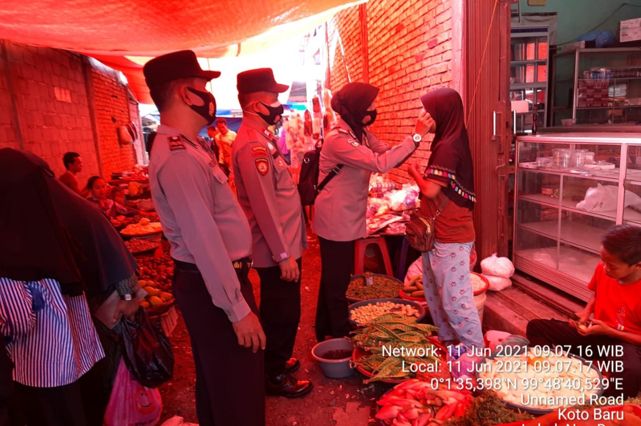 Personel sengaja berkeliling pasar dan menemui pedagang, pengunjung dan sejumlah petugas parkir untuk penekanan penerapan protokol kesehatan (prokes). Tim juga menegur masyarakat yang belum menggunakan masker dan memberikan edukasi kepada masyarakat.