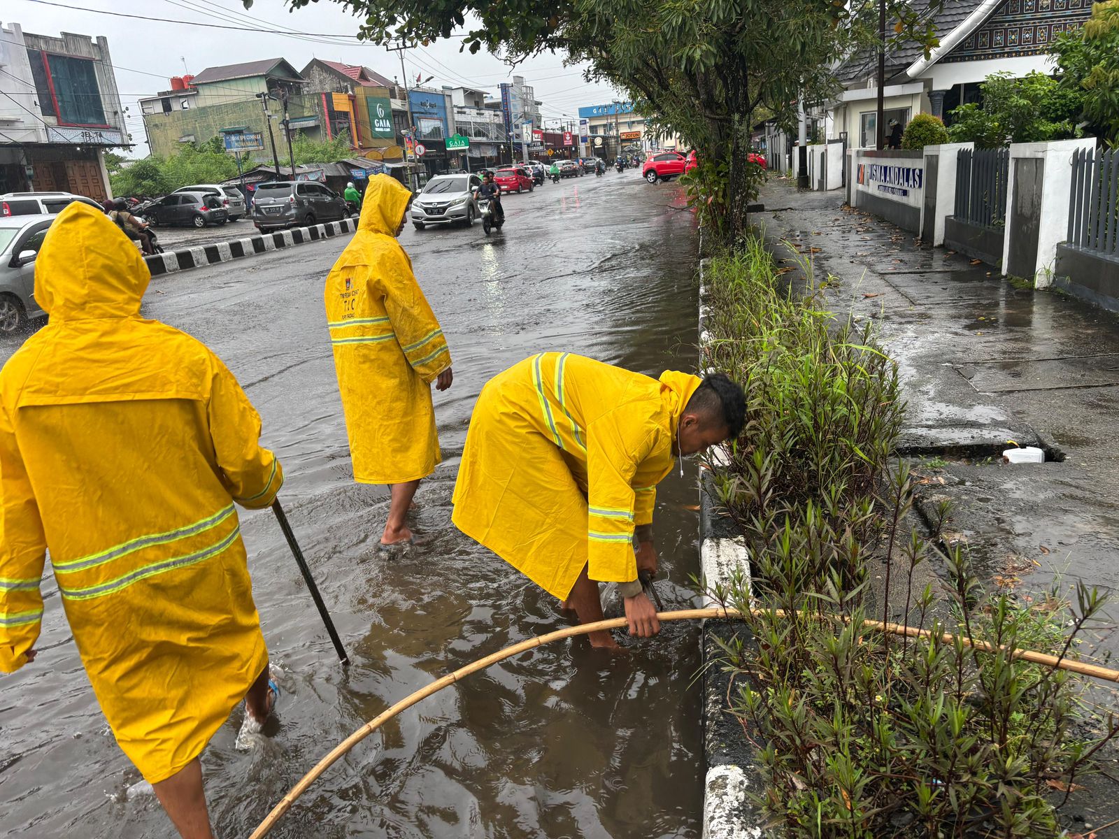 Seperti yang terlihat di Pasar Simpang Haru dan Jalan Sutomo, sekelompok petugas dari PUPR yang mengenakan jas hujan, langsung melakukan pengecekan saluran air dan drainase jalan.