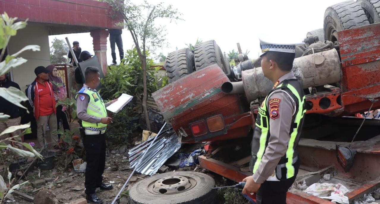 Kemudian, mobil boks menyenggol tiga pengendara sepeda motor. Truk trailer menabrak warung hingga terbalik di halaman rumah warga.