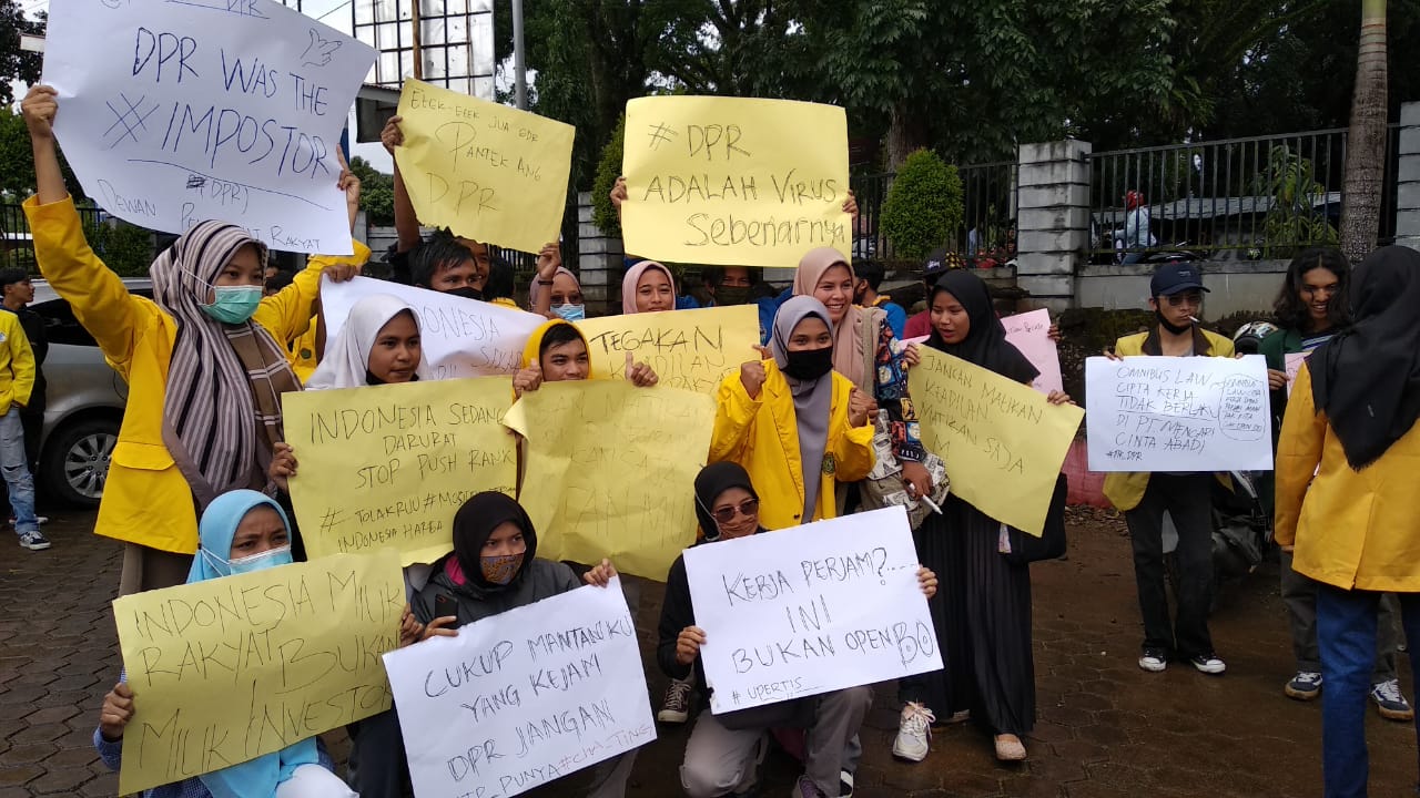 Meski turun hujan, ratusan mahasiswa bersama dua anggota DPRD tetap bertahan menyuarakan tuntutan dan kekecewaannya. Mereka berkomitmen akan menyuarakan semua keluhan dan ancaman bagi buruh dan masyarakat akibat disahkannya UU Omnibus Law Cipta Kerja pada 5 Oktober kemarin. Mereka juga mendesak anggota DPRD menyatakan pernyataan sikap dan mendesak presiden.