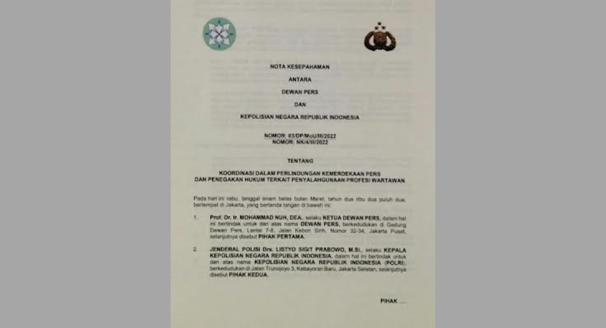 Diketahui, nota kesepahaman itu tertuang dalam surat Nomor: 03/DP/MoU/III/2022 dan Nomor: NK/4/III/2022 tentang Koordinasi Dalam Perlindungan Kemerdekaan Pers dan Penegakan Hukum Terkait Penyalahgunaan Profesi Wartawan. Sebelumnya, Dewan Pers dan Polri juga memiliki nota kesepahaman.