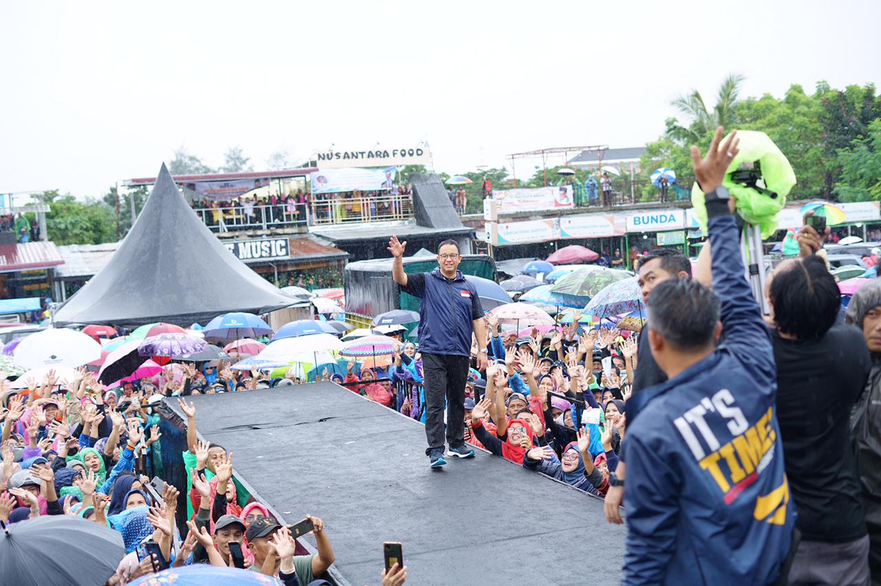 Anies Baswedan dalam rekaman video di Instagram politisi Partai Nasdem Willy Aditya terlihat ikut berhujan-hujan dengan masyarakat. Dari atas panggung ia berpidato, “Kita menyaksikan warna-warni payung yang menunjukkan apa? Artinya pada saat ibu dan bapak di rumah, hujan sudah terjadi. Dan melihat jendela keluar, menyaksikan hujan. Apa yang terjadi? Saya tetap berangkat, saya bawa payung, saya tunjukkan semangat,” kata Anies.