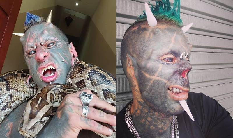 Contohnya saja seperti yang dilakukan oleh seorang pria asal Brazil ini. Tak hanya miliki tato, pria tersebut juga memodifikasi tubuhnya menyerupai bentuk yang aneh. Bahkan tak sedikit orang-orang yang menjuluki pria itu sebagai “manusia setan”.