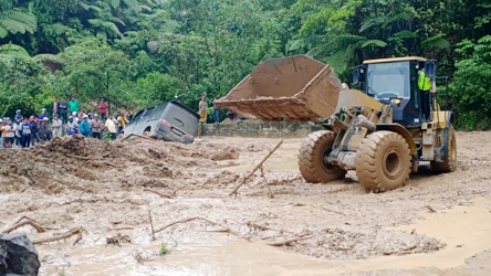 Selain menghambat arus kendaraan, material longsor juga menerjang satu unit minibus Daihatsu Luxio BA 1673 RF. Beruntung, minibus tersebut tertahan tembok yang berada di sisi jalan.