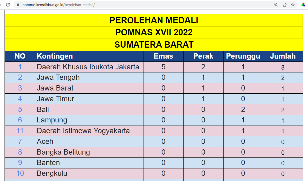 Langgam.id – Provinsi DKI Jakarta mendominasi perolehan medali sementara Pekan Olahraga Mahasiswa Nasional ke-17 yang digelar di Padang. Saat menyelesaikan seluruh pertandingan pada Jumat (18/11/2022), DKI Jakarta memperoleh 5 emas, 2 perak dan 1 perunggu.