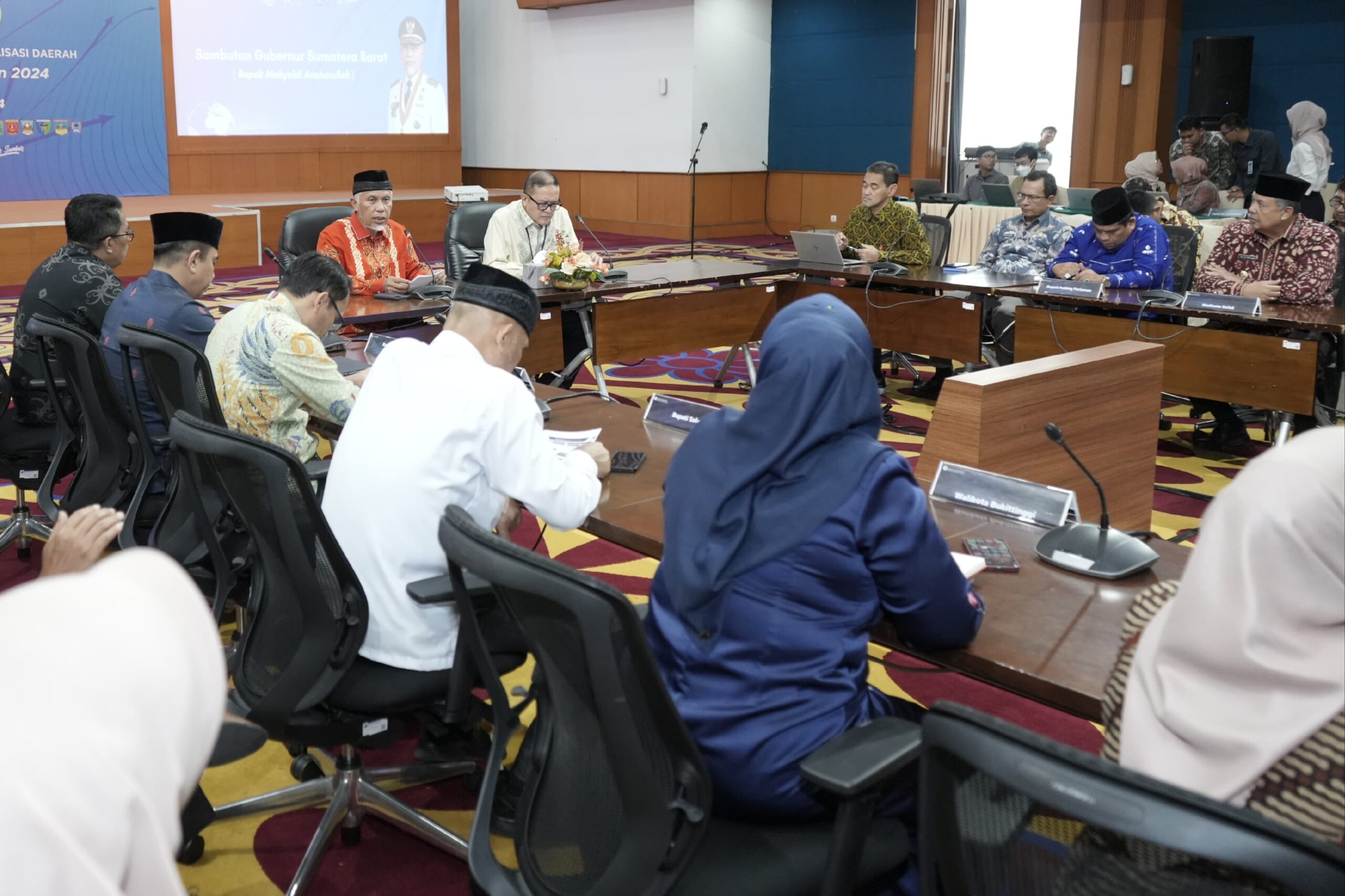 Gubernur Sumbar Mahyeldi bersama Kepala BI Sumbar Endang Kurnia Saputra memimpin high level meeting bersama sejumlah kepala daerah di Sumbar terkait optimalisasi penggunaan nontunai melalui KKPD. (Foto: Adp Sumbar)