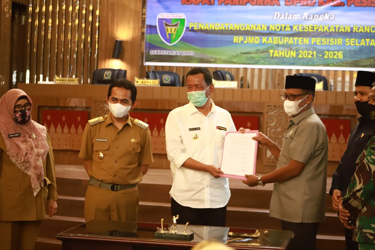 Langgam.id – DPRD Kabupaten Pesisir Selatan menggelar rapat paripurna penandatanganan nota kesepakatan rancangan awal (Ranwal) Rencana Pembangunan Jangka Menengah Daerah (RPJMD) tahun 2021-2026 di ruang sidang DPRD setempat, Selasa (27/4/2021).