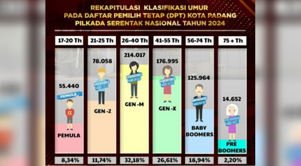 Berdasarkan rekapitulasi klasifikasi umur pada DPT Kota Padang untuk Pilkada 2024 tersebut, rentang umur 26-40 tahun (generasi milenial) merupakan jumlah pemilih terbanyak yaitu 214.017 orang atau 32,18 persen.