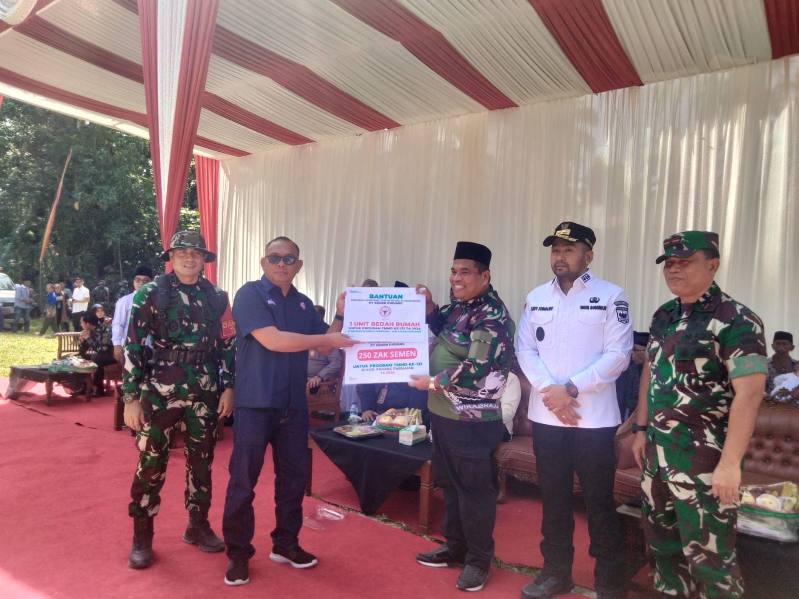 Langgam.id — PT Semen Padang menyerahkan bantuan 1 unit bedah Rumah Tidak Layak Huni (RTLH) dan 250 sak semen secara simbolis usai Upacara Pembukaan TNI Manunggal Membangun Desa (TMMD) ke-121 Tahun 2024 di Wilayah Kodim 0308/Padang Pariaman di Lapangan Bola, Korong Sungai Sirah, Nagari Kuranji Hulu, Kecamatan Sungai Geringging, Kabupaten Padang Pariaman, Rabu (24/7/2024).
