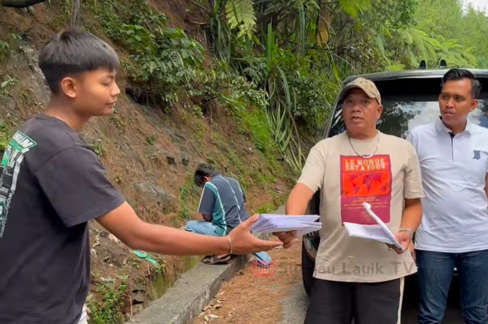 Fadlul yang keluar dari mobil dengan mengenakan kaos dan topi, tampak mengeluarkan amplop putih yang sudah disiapkan.