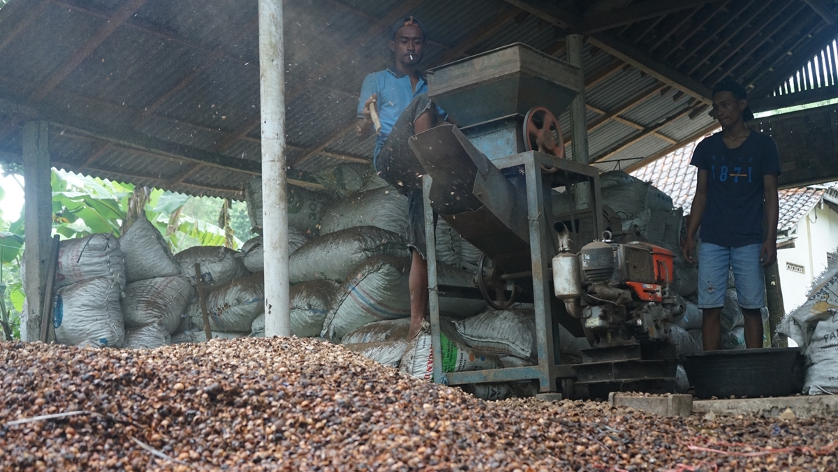 Biji nyamplung kering masuk ke mesin. (Foto: Farida Indriastuti)