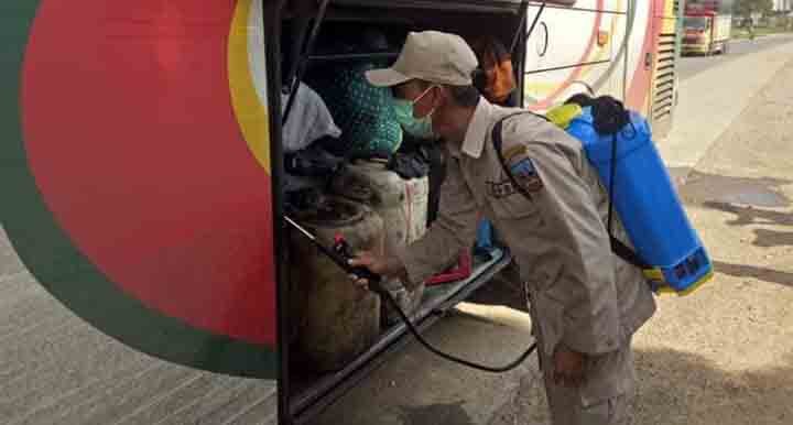 Petugas semprotkan disinfektan ke dalam bus yang masuk di perbatasan Sumbar-Jambi, tepatnya di Nagari Sungai Rumbai Dharmasraya. (Foto Diskominfo Dharmasraya)